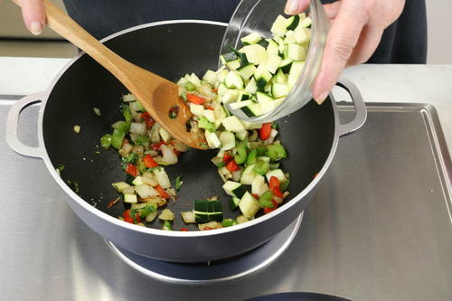 Add the zucchini, tomatoes and their can juices, spices and basil and continue to cook for 3 minutes.