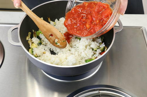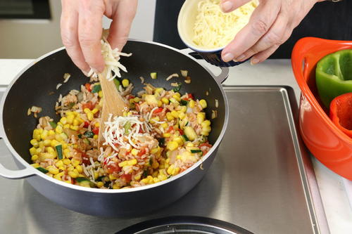 Add corn and rice and half of the cheese to the ingredients in the pan and stir to mix completely.