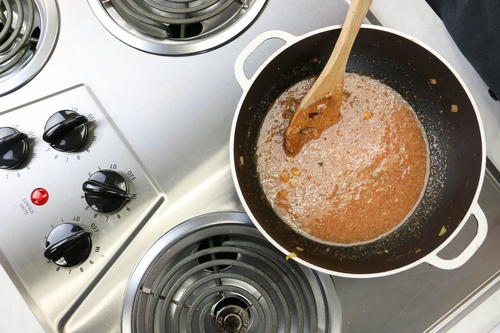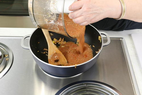 While filled peppers finish baking, place the reserved cup of tomato mixture into blender or food processor and puree.