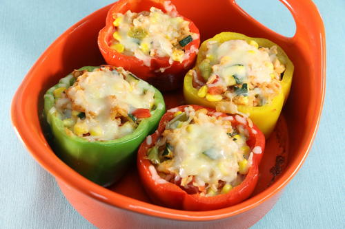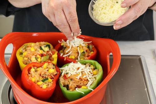 Spoon filling mixture into the peppers and cover bake dish with foil. Bake 20 minutes, then uncover and add distribute the remaining cheese equally on top of the peppers. Continue to bake, uncovered, for another 15 minutes.