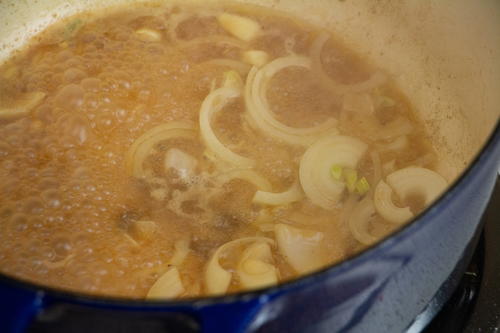 Remove the beef and set aside. Add the onions and garlic into the pot. Cook until the onions are translucent. Deglaze the pan with the white wine.
