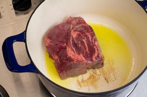 Place olive oil in the Dutch oven and sear the beef, 4 minutes per side.