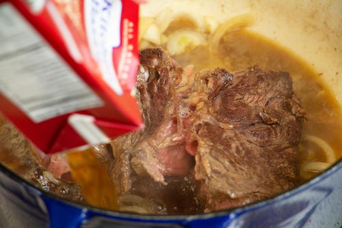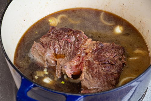 Add the 2 cups beef stock and bring to a boil. Add the beef back in and cover the pan with the lid.